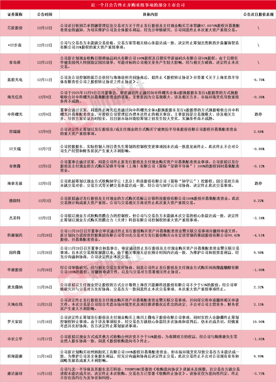 据财联社不完全统计,近一个月(11月13日至12月13日)包括芯原股份、*ST步森(002569)、青岛港(601298)、蓝盾光电(300862)、海光信息、中科曙光(603019)、思瑞浦、ST天瑞(300165)、帝奥微、海泰发展(600082)、德固特(300950)、杰美特(300868)、科源制药(301281)、国科微(300672)、华康股份(605077)、建龙微纳、天地在线(002995)、梦天家居(603216)、中农立华(603970)、滨海能源(000695)和康达新材(002669)在内的21家A股上市公司公告终止并购重组事项,详细情况见下图: