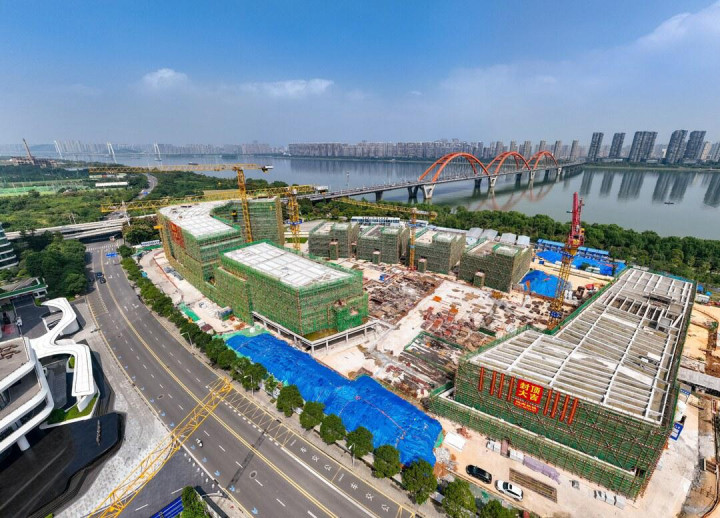 (9月29日,湖南湘江新区湘江基金小镇二期项目主体结构全面封顶,较计划提前3个月。该项目预计2026年上半年竣工,建成后将成为湖南金融新地标。湖南日报全媒体记者傅聪王晗摄影报道)